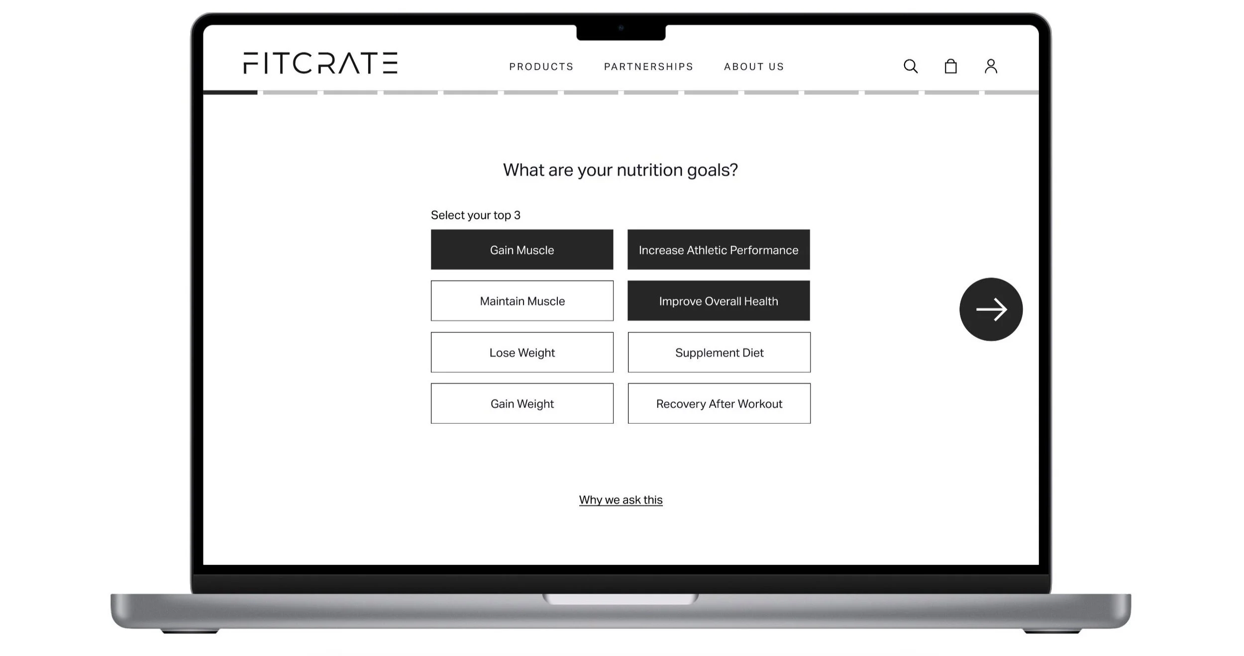 These insights led me to making sure that Fitcrate would have personalization, provide trustworthy and knowledgeable information, and offer a wide variety of quality products. These criteria would be represented in features of a questionnaire, product customization, and reviews and partnerships with different supplement brands and companies.