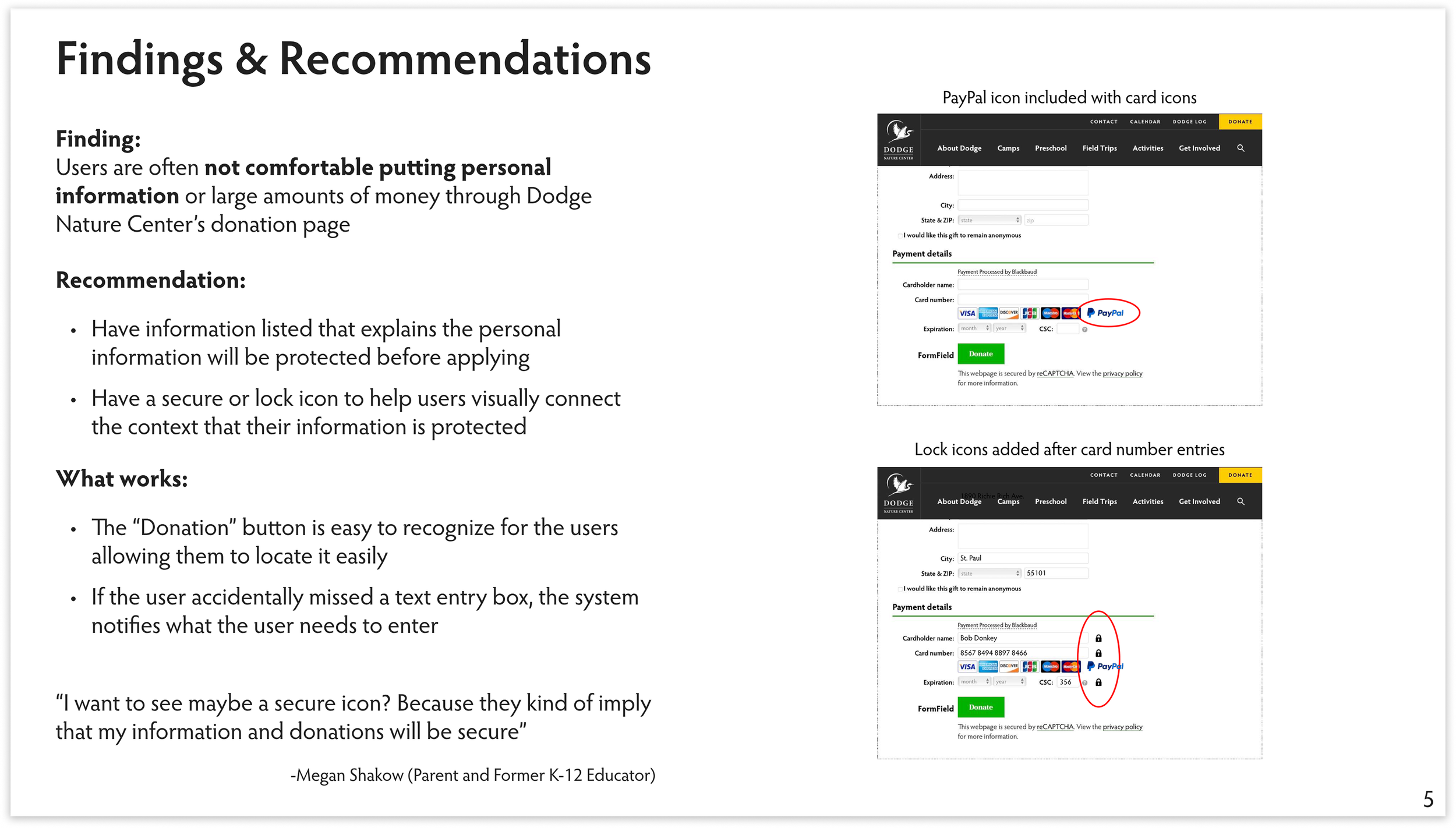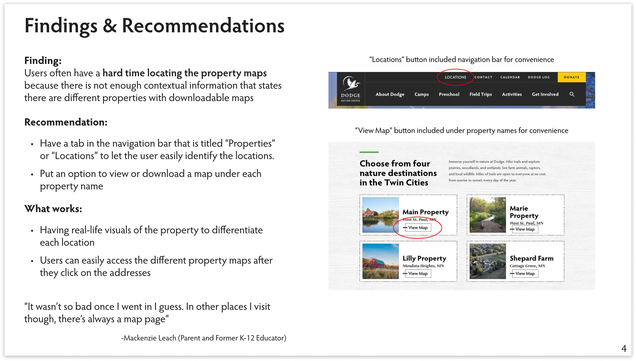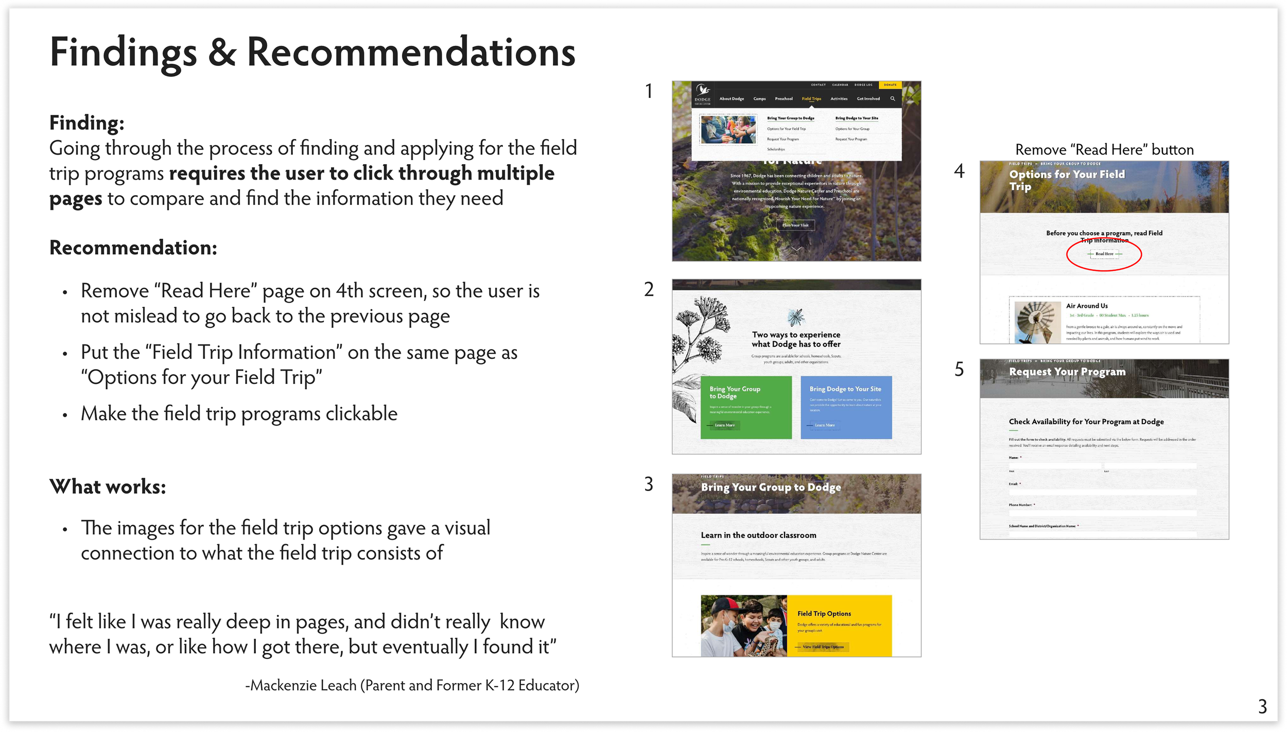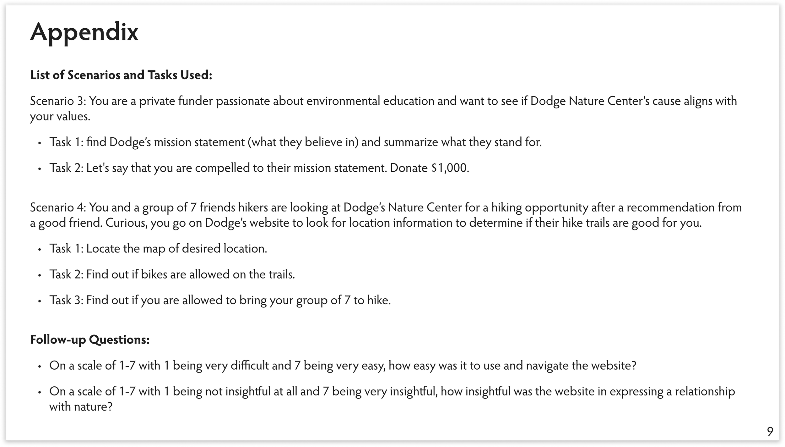 The intent of this research report is to find key insights through usability testing in order to offer recommendations to improve the usability of the Dodge Nature Center website.