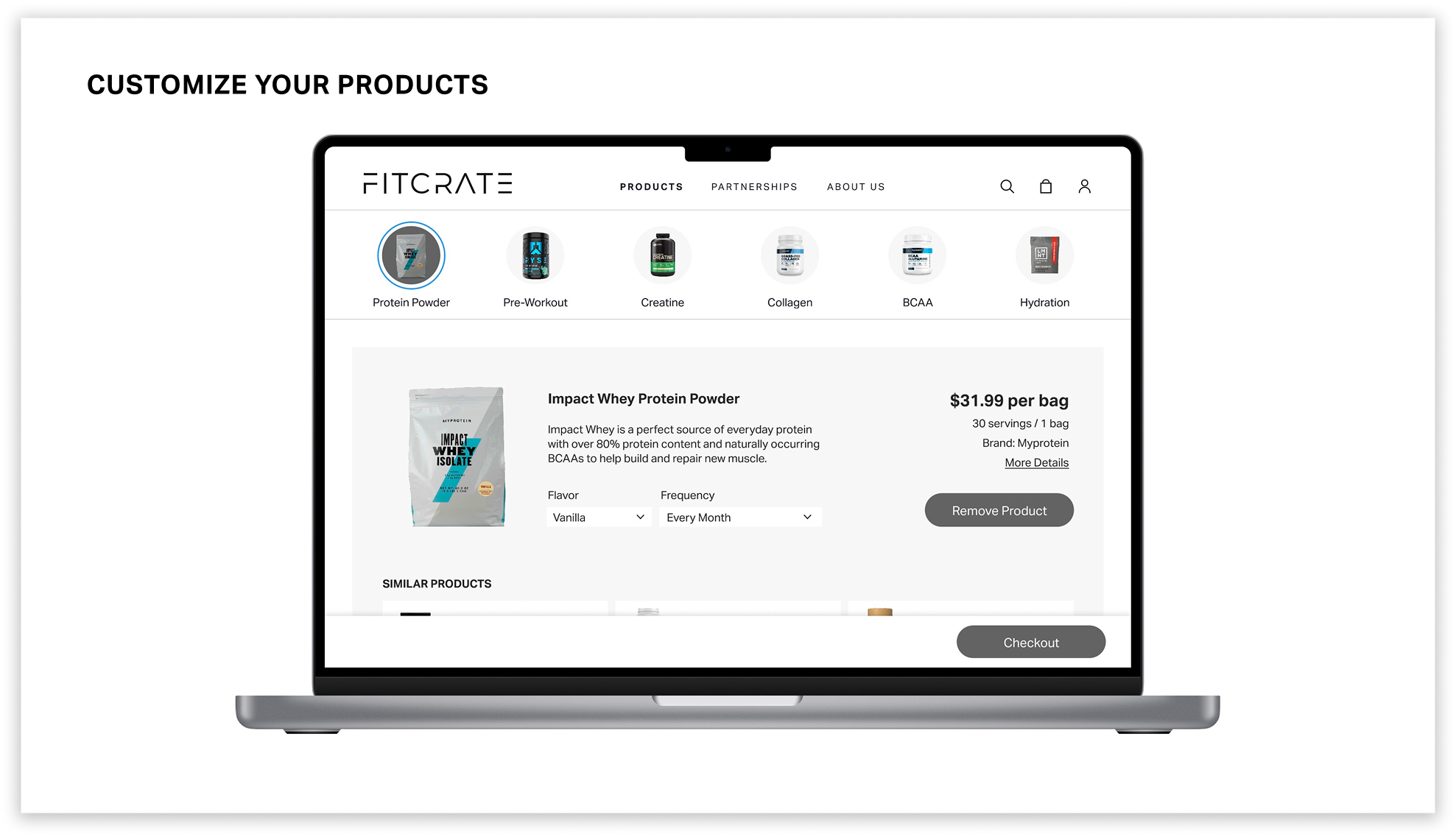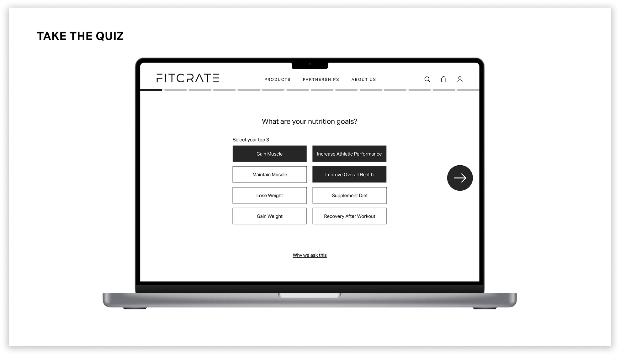 This feature enables users to take a quiz to determine which products are best suited for them. After finishing the quiz, the info is submitted, and the user receives a bundle of supplements relating to their answers. This feature is completely optional, but recommended for beginner and intermediate fitness goers. Users can skip the quiz to explore and create their own subscription bundle from a wide variety of products.