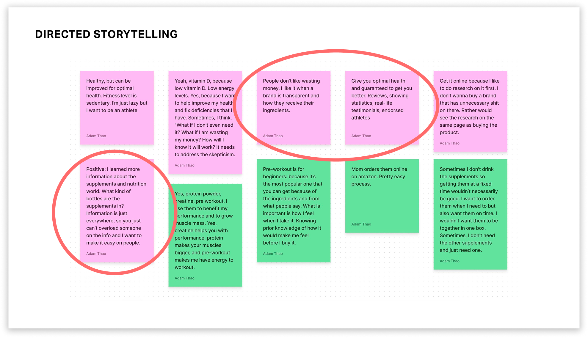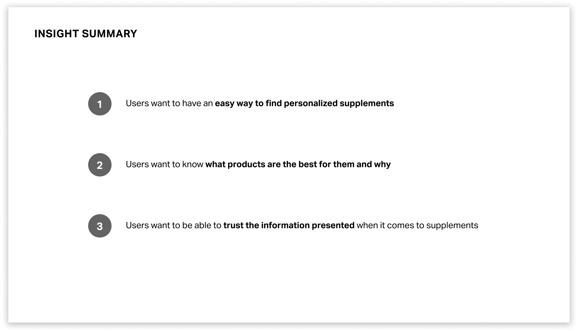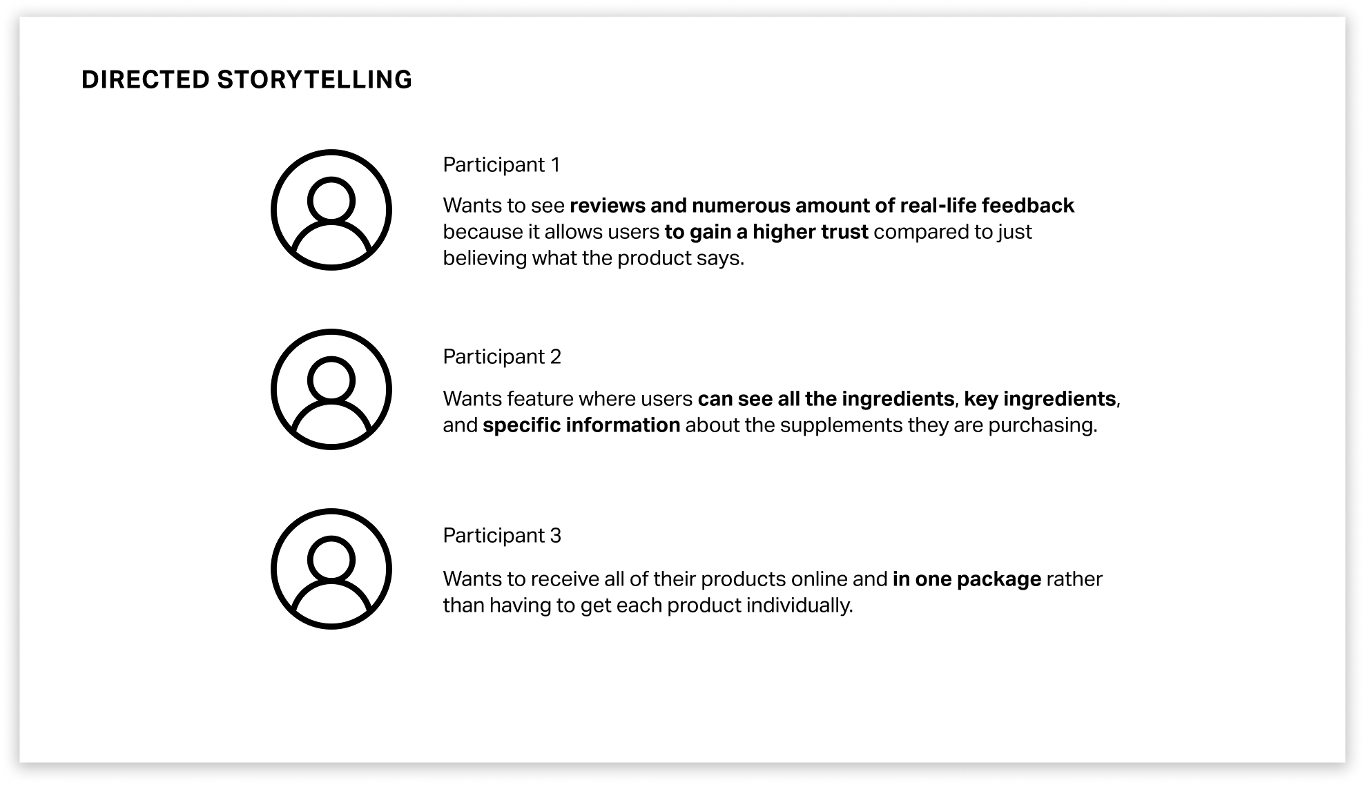 Through directed storytelling and analysis of competitor websites, I discovered that users want an easy way to find supplements catered to their needs, understand why the products are good for them, and want to be able to trust the information presented.