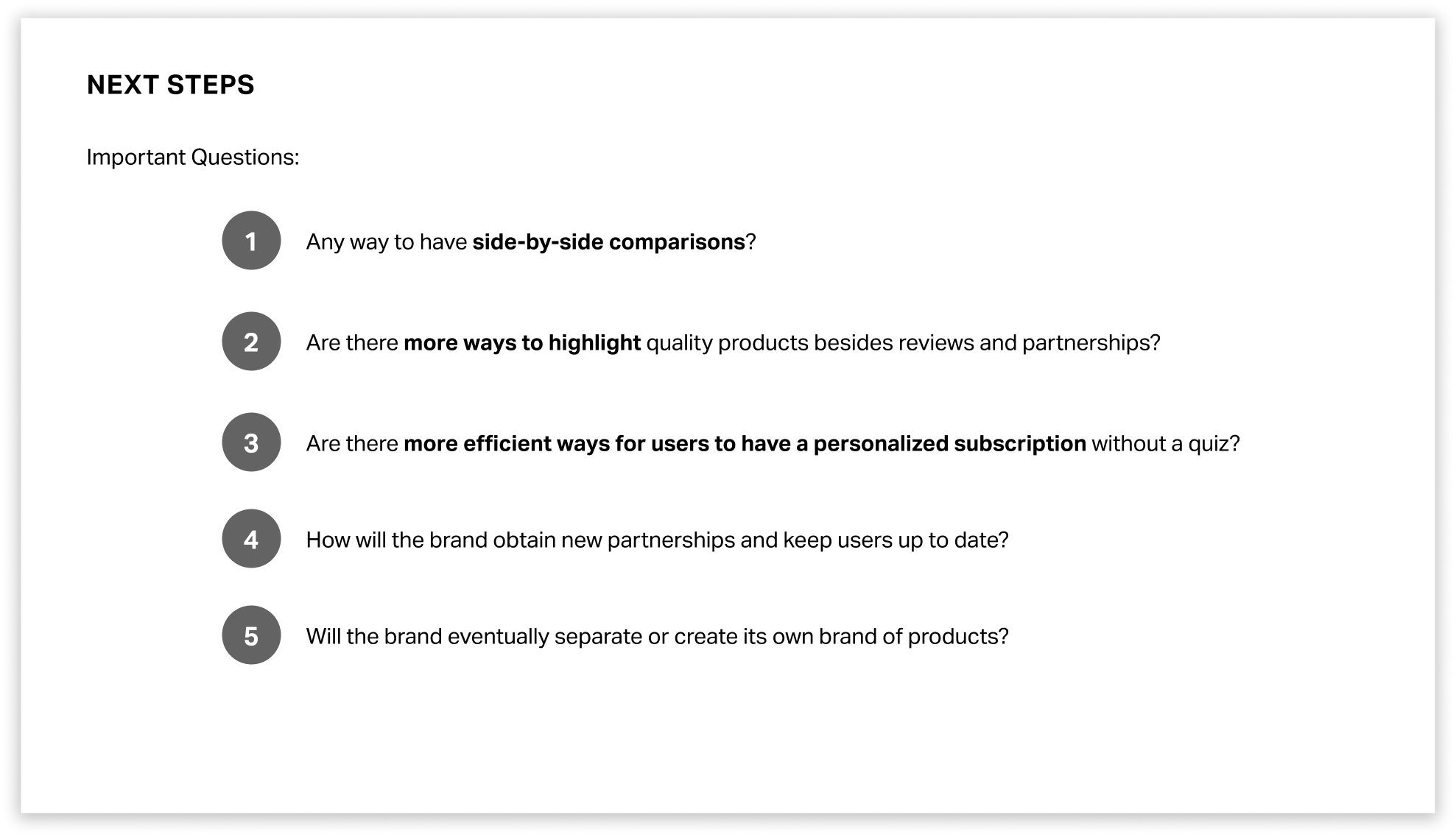 Some things that I am excited to dig deeper into are finding more ways to compare the products that are listed. For example, maybe thinking about having a way to compare two products side-by-side, or maybe even looking into more ways of verification for high-quality products. Here are some of the important questions to ask when thinking about the next steps of this project.