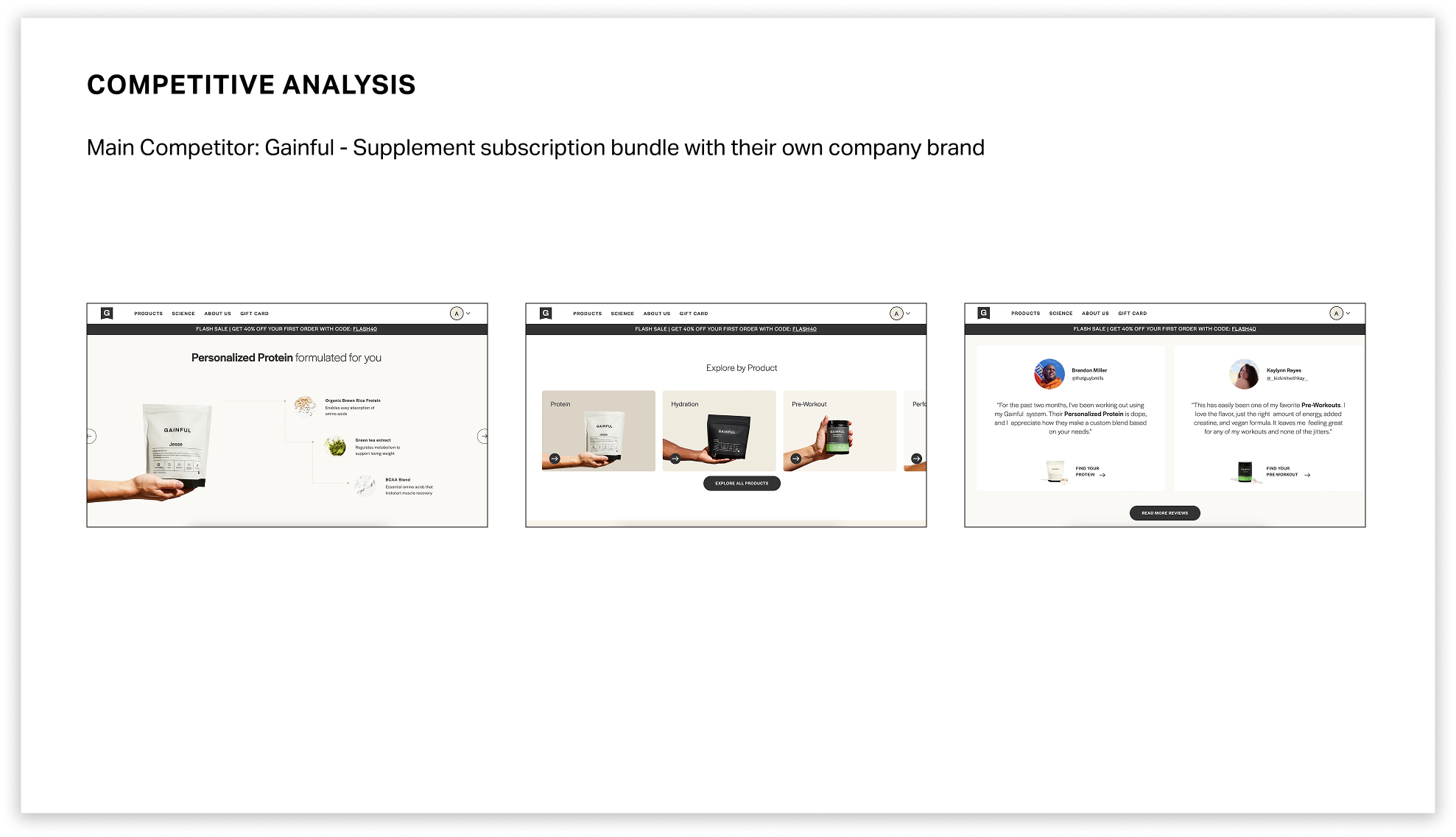 After user research, I conducted a competitive analysis to help me identify the strengths and weaknesses of the current competitors, which allowed me to identify opportunities to create a product that could exist in the current market space. There were six competitors: Gainful, Ritual, Cratejoy, Hungryroot, Pluto, and Bespoke Post. Gainful, a supplement subscription-based company, was the main competitor.