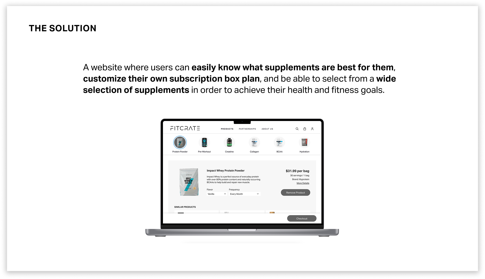 This page allows users to view the different partnerships that Fitcrate partners with to gain a higher level of trust in Fitcrate’s selection of products. The user can scroll through the carousel and view more information about each company.