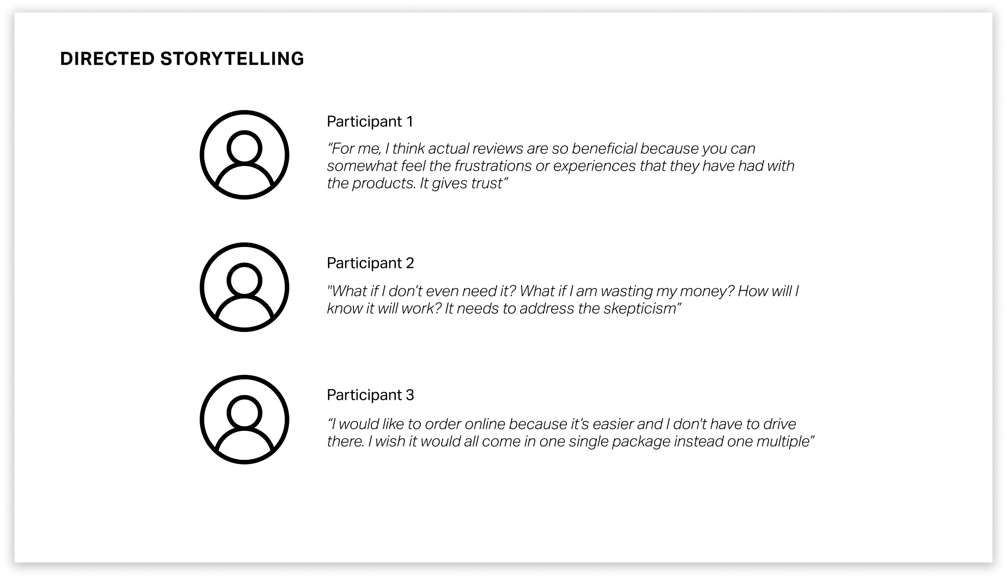 The first part of coming up with the solution (Fitcrate) was conducting user research. Directed storytelling through interviews with three participants allowed me to really understand the different pain points when it came to buying or using nutritional supplements.